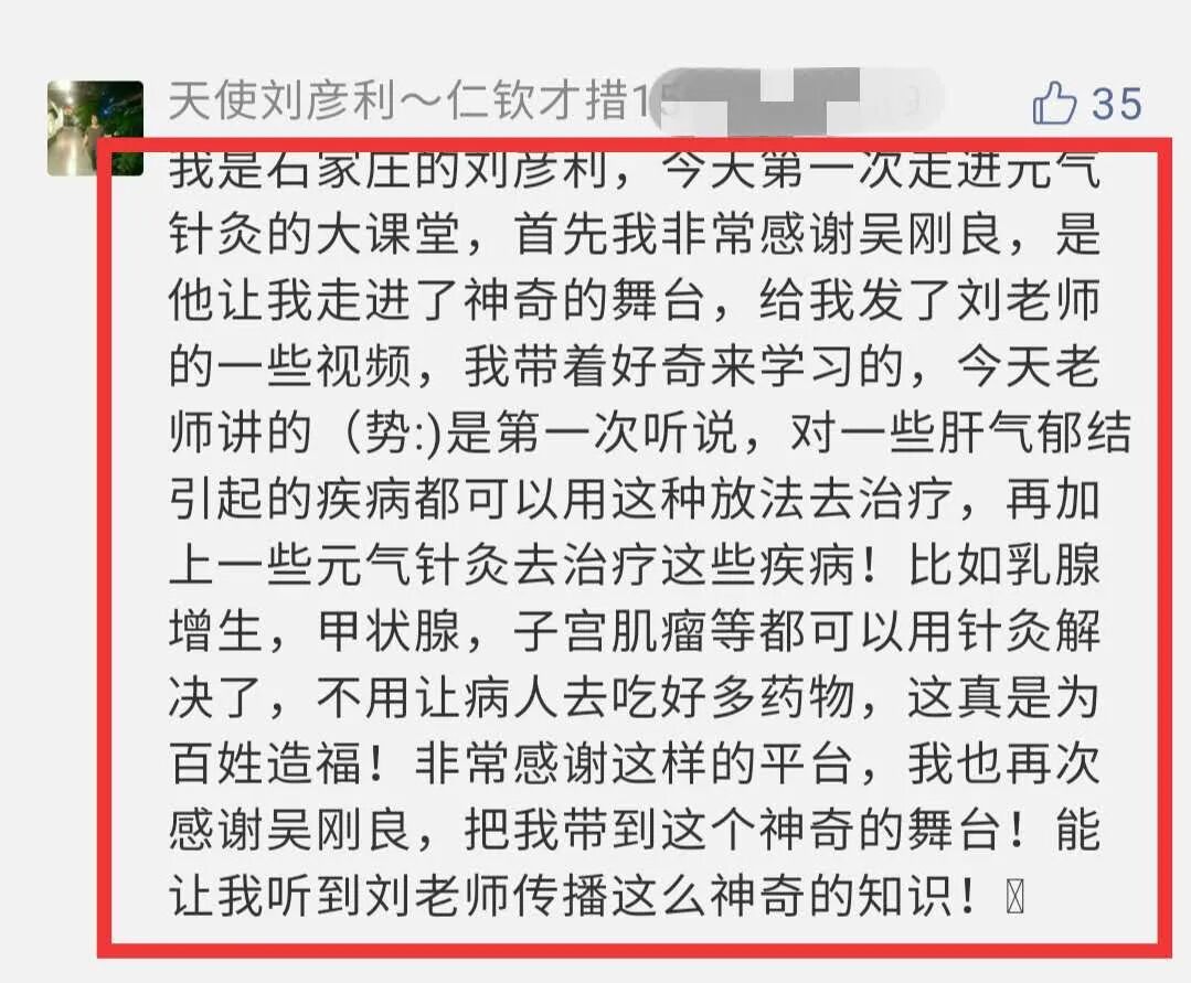我是石家庄的刘彦利,今天次走进元气针灸的大课堂,首先我非常感谢吴刚良,是他让我走进了神奇的针灸世界,给我发了刘老师的一些视频,我带着好奇来学习的,今天老师讲的(势)是次听说,对一些肝气郁结引起的疾病都可以用这种方法去治疗,再加上一些元气针灸体系中的针法去治疗这些疾病!比如乳腺增生,甲状腺,子宫肌瘤等都可以用针灸解决了,不用让病人去吃好多药物,这真是为百姓造福!非常感谢这样的平台,我也再次感谢吴刚良,把我带到这个神奇的世界!能让我听到刘老师传播这么神奇的知识!