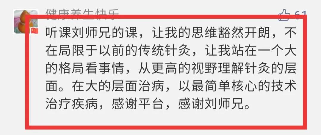 听了刘师兄的课,让我的思维豁然开朗,不再局限于以前的传统针灸,让我站在一个大的格局看事情,从更高的视野理解针灸的层面。在大的层面治病,以简单核心的技术治疗疾病,感谢平台,感谢刘师兄。