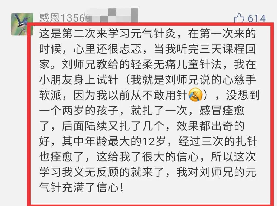 这是第二次来学习元气针灸,在次来的时候,心里还很忐忑,当我听完三天课程回家。刘师兄教给的轻柔无痛儿童针法,我在小朋友身上试针(我就是刘师兄说的心慈手软派,因为我以前从不敢用针),没想到一个两岁的孩子,就扎了一次,感冒痊愈了,后面陆续又扎了几个,效果都出奇的好,其中年龄大的12岁,经过三次的扎针也痊愈了,这给我了很大的信心,所以这次学习我义无反顾的就来了,我对刘师兄的元气针充满了信心!