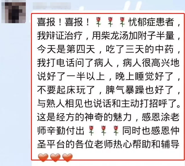仲圣师友喜报!抑郁症患者,通过师友辨证治疗,用柴胡加龙骨牡蛎汤加附子半量,吃了三天的中药,回访患者,患者很高兴地说好了一半以上,晚上睡觉好了,脾气暴躁好了,与熟人相见也主动说话打招呼了。这是经方的神奇魅力,感恩涂华新导师辛勤付出,也感恩仲圣平台各位老师热心帮助和辅导。