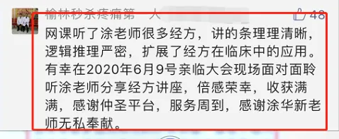 微信名为@榆林秒杀疼痛人 师友说:网课听了涂华新导师讲的很多经方,条理清晰,逻辑推理严密,扩展了经方在临床中的应用。有幸在2020年6月9日,亲临《仲圣经方临床实战讲座》现场,面对面聆听涂华新导师分享经方,倍感荣幸,收获满满,感谢仲圣平台,服务周到,感谢涂华新导师无私奉献!