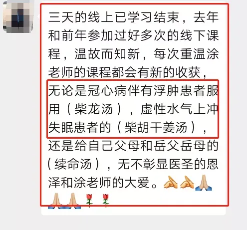 仲圣师友分享:三天的线上课程已经学习介绍,去年和前年参加多次仲圣平台的线下课程,温故而知新,每次重温涂华新导师的经方讲座课程,都会有新的收获,无论是冠心病伴浮肿患者服用(柴胡加龙骨牡蛎汤),虚性水气上冲失眠患者的(柴胡肉桂干姜汤),还是给自己父母和岳父母的(续命汤),无不彰显医圣的恩泽和涂华新导师的大爱。