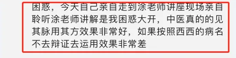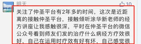 微信名为@明天 的师友说:关注了仲圣平台有2年多的时间,这次是近距离接触仲圣平台,通过接触倾听涂华新导师的经方讲座,让我感触很深,平时在仲圣平台的微信公众号,看到师友们发的治疗某种疾病时,通过运用经方,疗效很好,自己在运用时,疗效有好有坏,感觉很困惑。今天自己亲自走到仲圣平台的经方讲座现场,聆听涂华新导师讲解,我困惑大开,中医诊的是见其脉用其方,效果非常好,如果按照西医的病名,不去辨证运用效果会非常差。