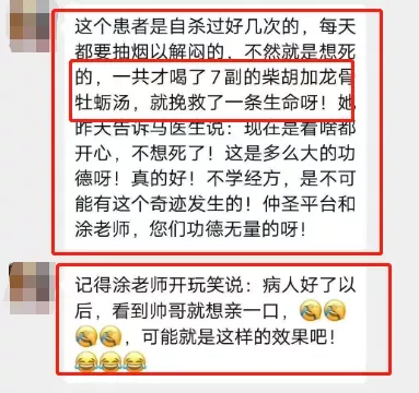 仲圣师友分享:这个患者自杀过好几次,没有都要抽烟以解闷,不然就是想死的,一共才喝了7剂柴胡加龙骨牡蛎汤,就挽救了一条生命呀!患者告诉师友,现在是看啥都开心,不想死了!这是多么大的功德呀!真的好,不学经方,是不可能有这个奇迹发生的!仲圣平台和涂华新导师,您们的功德无量呀!