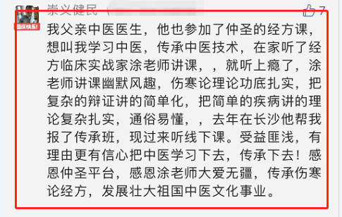 微信名为@崇义健民 的师友说:我父亲是中医医生,他也参加仲圣平台的经方讲座,想叫我学习中医,传承中医技术,在家听了经方临床实战家涂华新导师讲经方,一听就上瘾了,涂老师讲课幽默风趣,伤寒论理论功底扎实,把复杂的辨证讲的简单化,把简单的疾病讲的理论复杂扎实,通俗易懂。去年在长沙,父亲帮我报了《仲圣经方薪火传承讲座》,现在过来听线下课,受益匪浅,有理由更有信心把中医学习下去,传承下去!感恩仲圣平台,感恩涂华新导师大爱无疆,传承伤寒论经方,发展壮大祖国中医文化事业。
