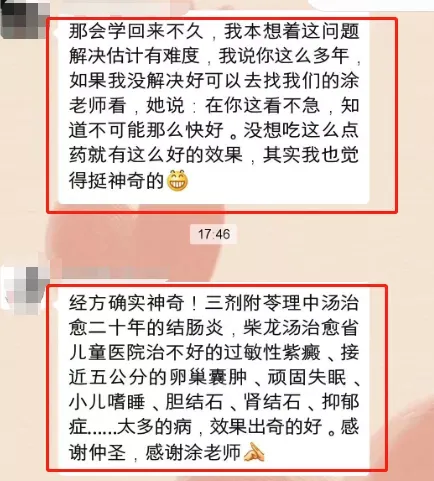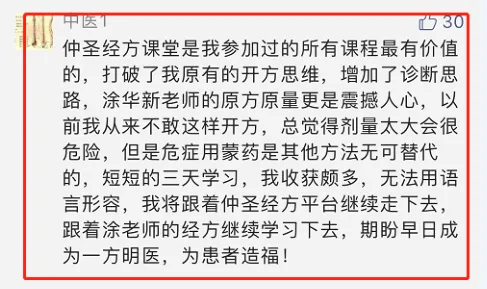 微信名为@中医1 的师友说:仲圣经方课堂是我参加过的所有课程中有价值的,打破了我原有的开方思维,增加了诊断思路,涂华新导师的原方原量更是震撼人心,以前我从来不敢这样开方。短短三天学习,我收获颇多,无法用语言形容,我将跟着仲圣平台继续走下去,跟着涂华新导师讲的经方继续学习下去,期盼早日成为一方明医,为患者造福!