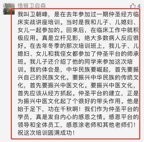 微信名为@悟猴卫启森 的师友说:我去年参加过一期《仲圣经方临床实战讲座》的学习,当时是我和儿子、儿媳妇、女儿一起参加的。回来后,在临床工作中就积极应用。真是立竿见影,绝大多数病人反应很好。在去年冬季的那期讲座中,我儿子、儿媳妇、女儿和我侄女都参加了仲圣平台的《仲圣经方薪火传承讲座》的学习,我儿子还介绍了他的同学来参加这次学习。我的体会是,中华民族要崛起,首先要振兴中医文化,从经方抓起。仲圣平台的建立,正是为振兴中医文化,起了一个很好的带头作用。作为仲圣师友,真是发自内心的感恩之情。感恩仲圣平台,感恩涂华新导师!