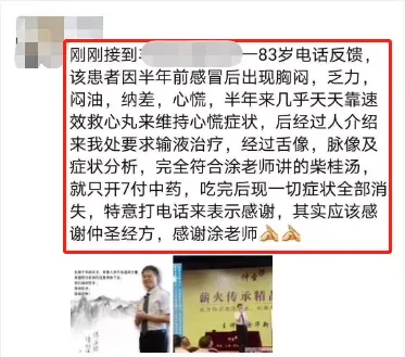 仲圣师友分享:刚刚接到一位83岁患者电话反馈,该患者因半年前感冒后出现胸闷、乏力、纳差、心慌,半年来几乎天天靠速效救心丸维持心慌症状,后经人介绍,来我处要求输液治疗,经过舌象、脉象及症状分析,完全符合涂华新导师讲的柴胡桂枝汤证,就只开了7剂中药,患者吃完后,现在一切症状全部消失,特意打电话来表示感谢。其实应该感谢仲圣平台,感谢涂华新导师!