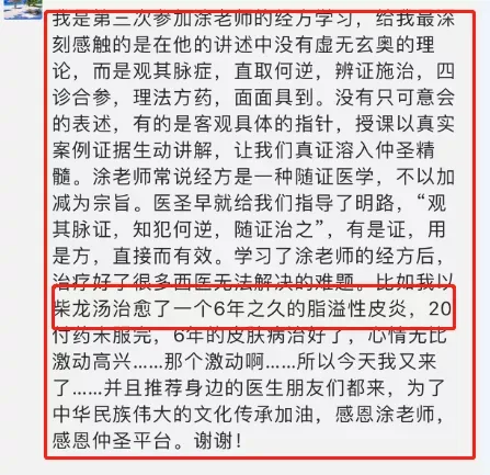 这位师友说:我是第三次参加涂华新导师的经方学习,深刻的感触是,在涂老师的讲述中,没有虚无玄奥的理论,而是观其脉证,知犯何逆,辨证论治,四诊合参,理法方药,面面俱到。没有只可意会的表述,有的是客观具体的指针,授课以真实案例证据生动讲解,让我们真正融入仲圣精髓。涂老师常说,经方是一种随证医学,以不加减为宗旨。医圣早就给我们指导了明路。有是证,用是方,直接而有效。学习了涂老师讲的经方后,治疗好了很多西医无法解决的难题。比如我以柴胡加龙骨牡蛎汤治愈了一个6年之久的脂溢性皮炎,20剂药未服完,6年的皮肤病治好了,心情无比激动高兴……那个激动啊……所以,今天我又来了……并且推荐身边的医生朋友们都来,为了中华民族伟大的中医文化传承加油,感恩涂老师,感恩仲圣平台!