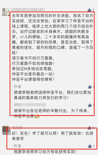 曾经参加过《仲圣经方临床实战讲座》的李刚师友说:在家学习了仲圣平台的线上经方课程,临床上也大胆用了几个经方结合刘长青师兄的元气针灸,治疗过新发的半身麻木、顽固的失眠多梦,小儿便秘,二十多年的面瘫伴有高血糖,都收到了很好的疗效,甚至治愈,取得了患者的信任,提升了我的口碑,造福了一方百姓!