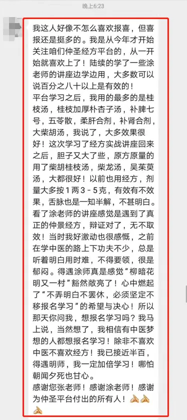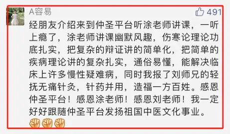 微信名为@A容易 的师友说:经朋友介绍来到仲圣平台听涂华新导师讲经方,一听就上瘾了,涂老师讲课幽默风趣,《伤寒论》理论功底扎实,把复杂的辨证讲的简单化,把简单的疾病理论讲的复杂扎实,通俗易懂,能解决临床上许多慢性疑难病,同时,我还报名了仲圣平台刘长青导师的元气针灸讲座,针药并用,造福一方百姓。感恩仲圣平台!感恩涂老师,感恩刘老师!我一定好好跟随仲圣平台发扬祖国中医文化事业。