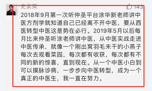 微信名为@史素英 的师友说:2018年9月,次听仲圣平台涂华新导师讲中医经方,就知道自己已经离不开中医,要从西医转型中医,这是势在必行。2019年5月以后每月必来仲圣平台听涂华新导师讲经方,从仲圣经方临床实战讲座,到仲圣经方薪火传承讲座,就像一个刚出窝羽毛未干的小燕子,每次去观看菜园,每次都有收获,每次都有不同的新的惊喜,直到现在。从一个中医小白到可以摸脉诊病,一步步向中医转型,成为一个真正的中医,我一直在努力。