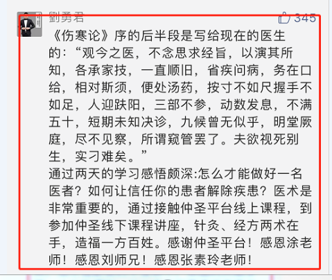 微信名为@刘勇君 的师友说:《伤寒论》序的后半段是写给现在的医生的:观今之医,不念思求经旨,以演其所知,各承家技,始终顺旧。省疾问病,务在口给,相对斯须,便处汤药,按寸不及尺,握手不及足,人迎、趺阳,三部不参,动数发息,不满五十,短期未知决诊,九候曾无仿佛,明堂阙庭,尽不见察,所谓窥管而已。夫欲视死别生,实为难矣!通过两天的学习,感悟颇深:怎么才能做好一名医者?如何给信任你的患者解除疾患?医术是非常重要的,通过接触仲圣平台线上课程,到参加仲圣平台线下课程,针灸、经方两术在手,造福一方百姓。感谢仲圣平台!感恩涂老师,感恩刘师兄!